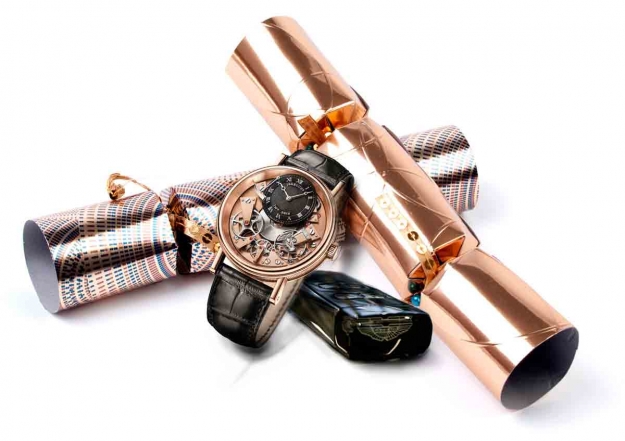 World’s Most Luxurious Christmas Crackers contain: an Aston Martin Vanquish Coupe (£190,000), Breguet Tradition Watch (£19,000), Cartier Diamond Necklace (£18,600), Graf Von Faber-Castell (£6,500), 1 Like No Other Trip (£77,500), Sunseeker Yacht (£3,700,000).