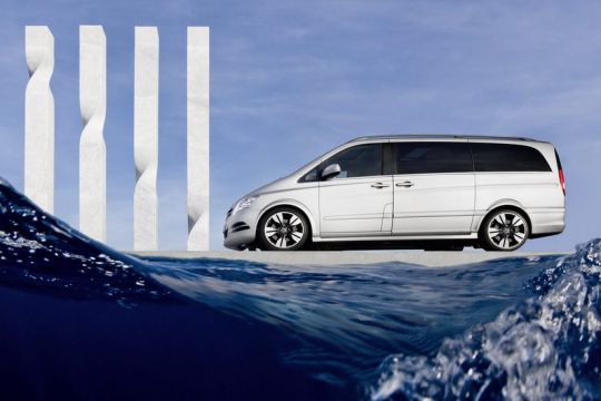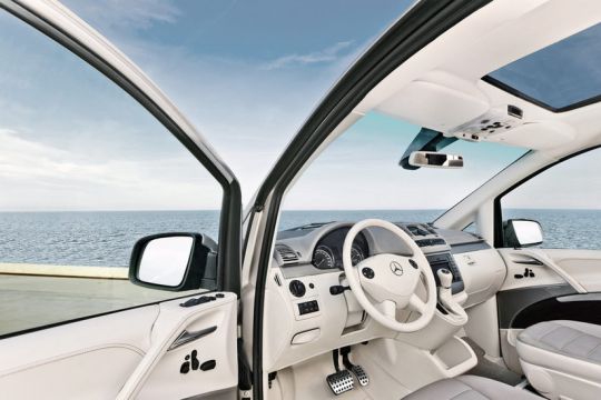 Viano Vision Pearl’s design concept takes its inspiration from that of modern sporting yachts, with the theme of travel as an experience. The onboard W-LAN connectivity caters for the needs of modern, mobile individuals. For ther exterior design, Mercedes-Benz has for the first time in the van sector used the paint finish “magno pearl grey”, a matt, pebble-grey colour. The stylistically revised front end of the Viano with its integrated LED daytime running lamps gives the van a more sporty, powerful appearance.