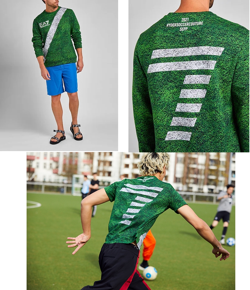 With the most important football event kicking off in Rome soon, YOOX decided to dedicate a special collection to Italy, with EA7 Emporio Armani. YOOX and SEPP – Football Fashion, a magazine curated by Markus Ebner since 2002 – have collaborated again for #YOOXSOCCERCOUTURE to launch a capsule collection in partnership with EA7 Emporio Armani. The winning strike: a graphic that is a reminiscent of a football field.