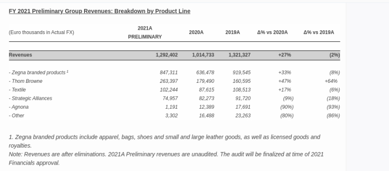 “By focusing on our legacy brand – which is going through a major rebranding – and on the further strengthening of our one-of-a-kind Made in Italy luxury textile platform coupled with the dynamic pace at which Thom Browne continues, we were able to deliver a strong financial performance in 2021. While we will continue to monitor world events and the COVID pandemic’s potential impacts on our business, we remain optimistic about our growth in 2022, with improved profitability.” – Ermenegildo “Gildo” Zegna, Chairman and CEO of the Zegna Group.